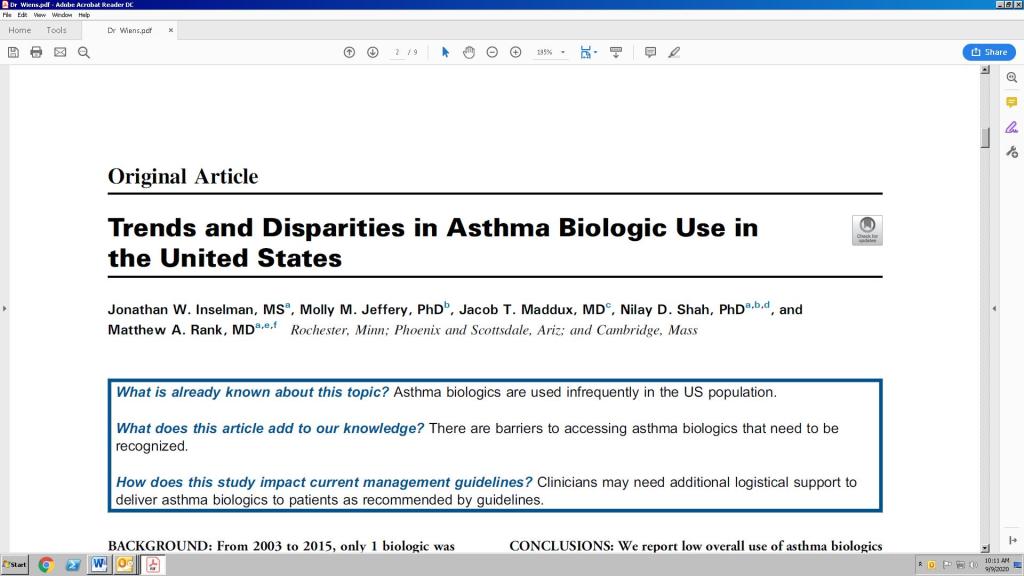 I have to put my nerd hat on every so often and talk about a study that analyzes asthma care. (Inselman Jw, et al: Trends and disparities in asthma biologic use in the United States. J Allergy Clin Immunol Pract. 8: 549-554, 2020) Often, researchers will identify and study patients with insurance claims for asthma medication, because the data is more readily available. In this case, investigators looked at claims from 2003 and 2018. They found biologic use in 6,642 individuals and analyzed their use over time.