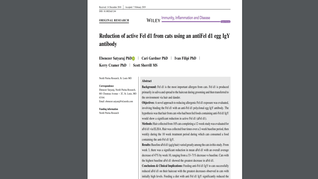We spend our careers as allergists figuring out what can reduce cat dander symptoms in allergic patients–allergy immunotherapy can certainly be helpful, but what if we could just change the cat? That would be fantastic! USA Today has run an article on changing your cat food to Purina Pro Plan to do exactly just that–change what your cat is eating and change the allergen they shed to make you wheeze & sneeze! Look at the link below before it expires to find out more! What allergen is important from cats? Try Fel d1 as a starter. Super cat food!